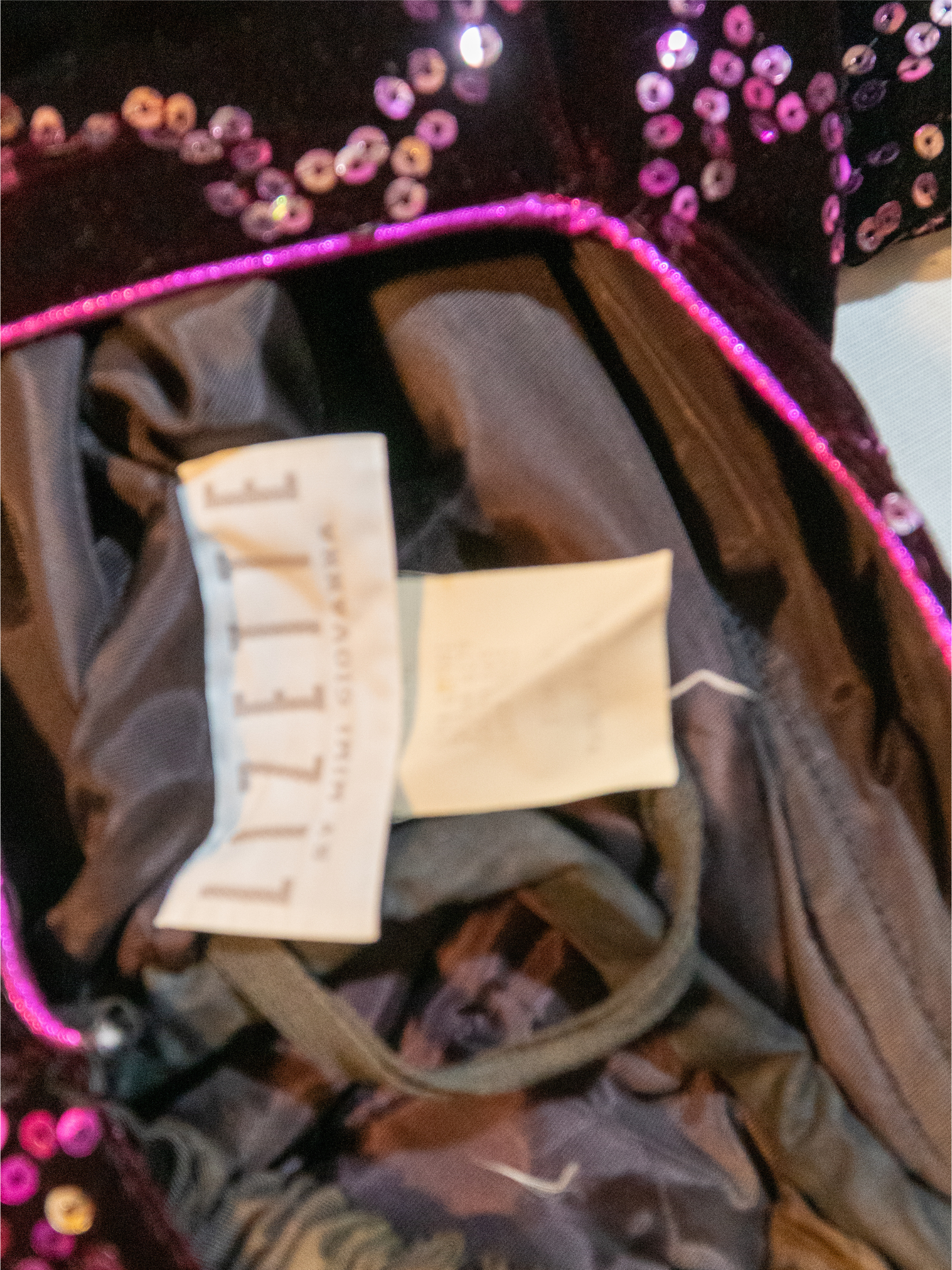 1980s vintage velvet mini dress shimmering with winding trails of amethyst and magenta sequins across a dark plum velvet.