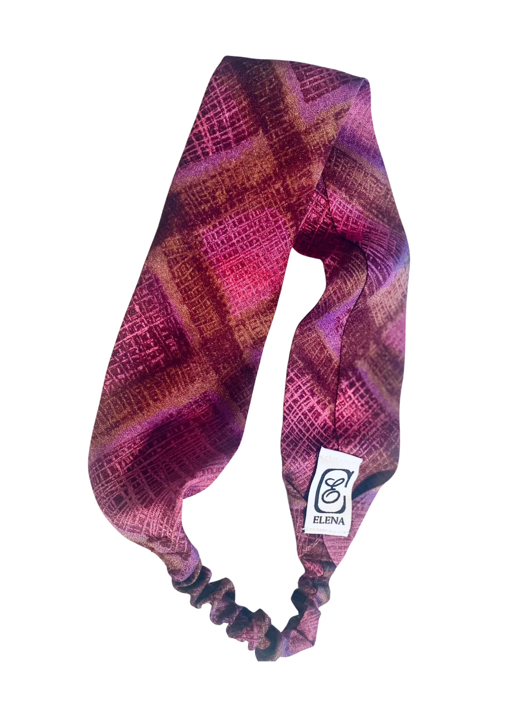 Vintage abstract tartan print headband in plum & orchid, accented with bronze and brown. Elastic band on the back of the neck to keep it extra secure.