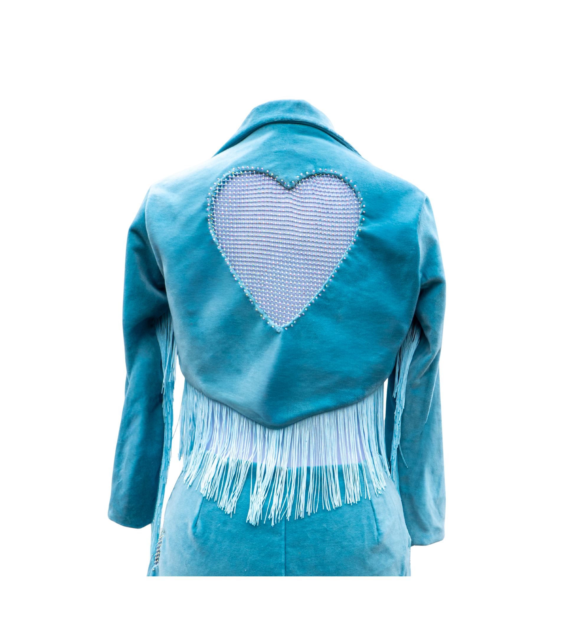 The Heartache Blazer is cut from powder blue velvet and crystal embellished mesh, trimmed out with matching blue fringe along the cropped hem and sleeves. Inspired by Western Stagewear and vintage rhinestone country glamour, the heart-shaped cut-outs reveal flashes of skin through sparkling mesh.