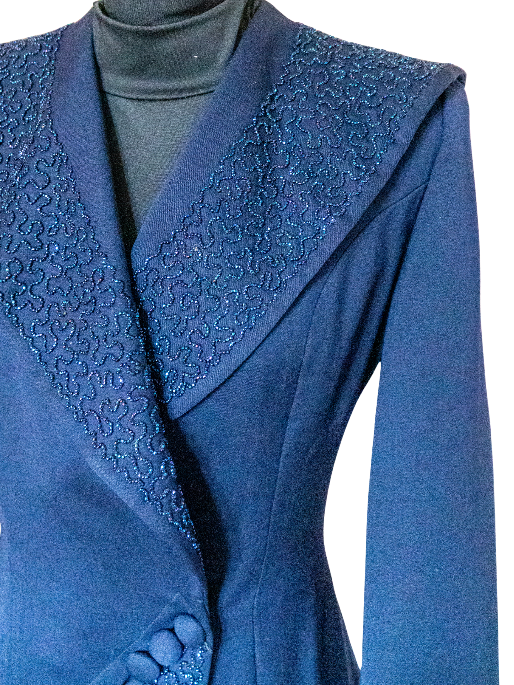 Cut from 100% virgin wool, this midnight blazer embodies the "New Look" philosophy: a cinched waist, strong shoulders, and an elegantly flared peplum. Each seam is deliberate; each curve feels designed for both function and theatre. The surface shimmers with iridescent glass bead embroidery, hand-applied in looping constellations. Covered buttons secure the front with quiet authority.