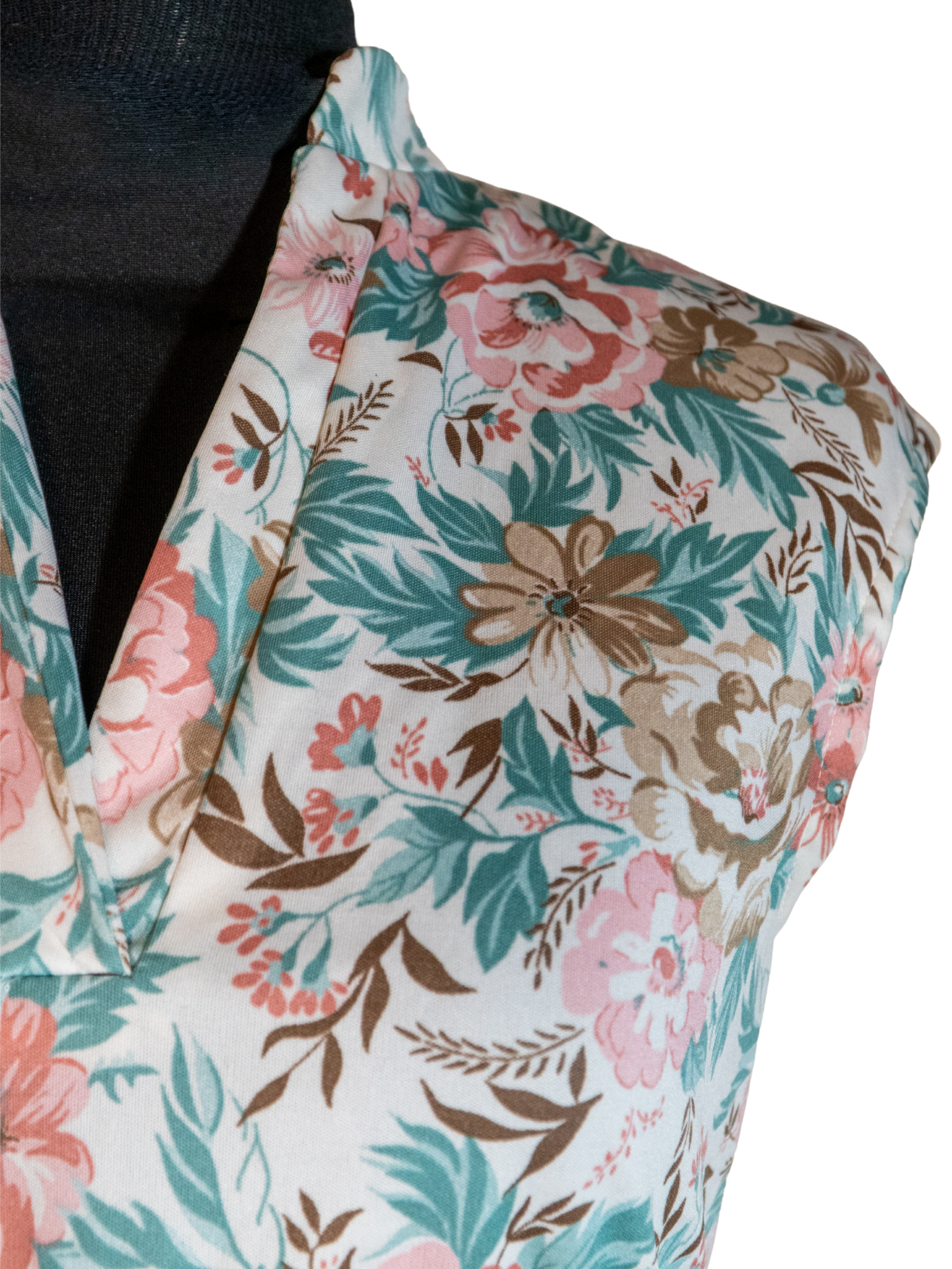 Sleeveless floral dress by Amy Deb in soft ivory polyester with a bold botanical print in teal, coral, brown, and moss. Designed with a softly draped neckline and an elasticized waist for easy shaping, the silhouette flows into a fluid skirt.