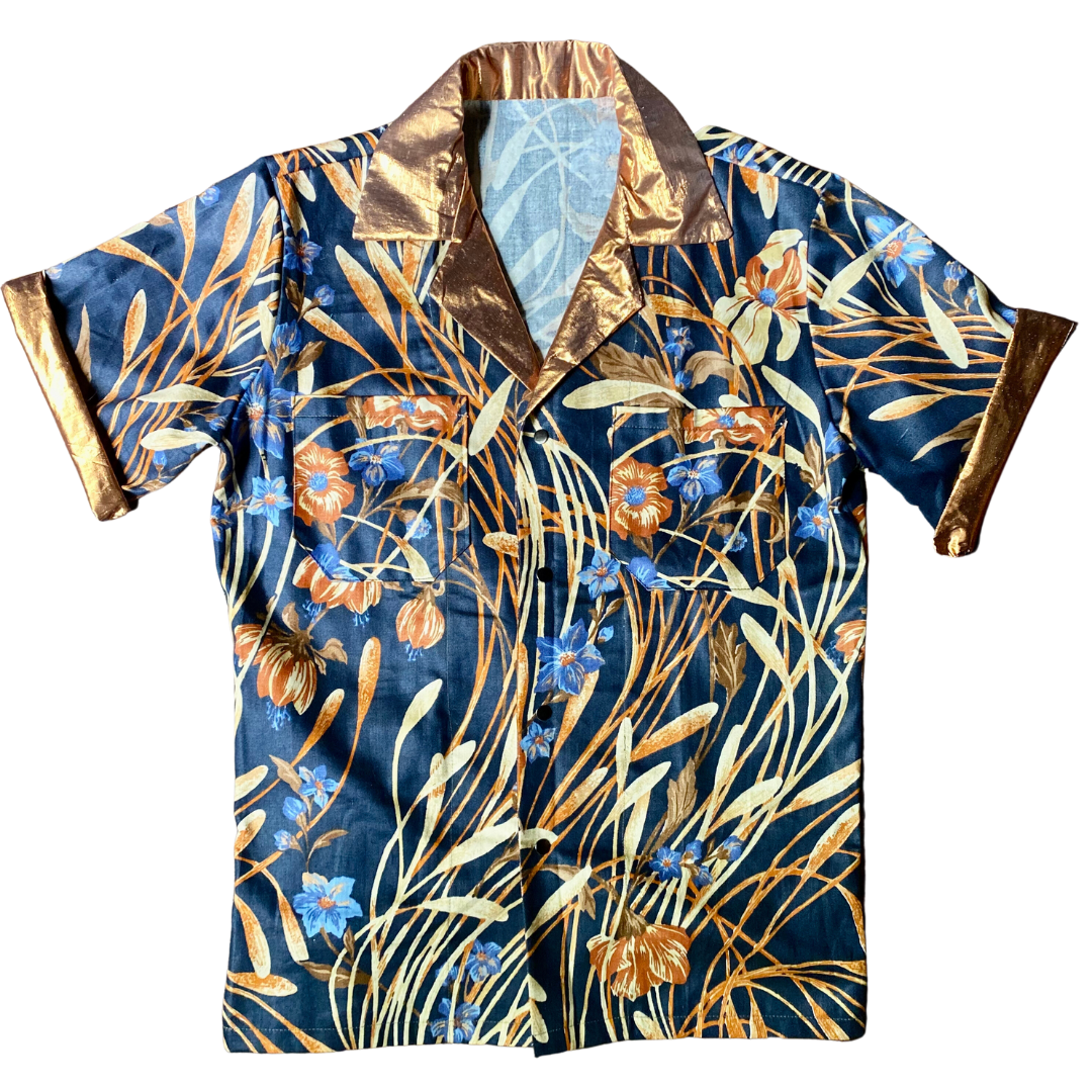 Collard shirt in a dark and moody floral pattern, with bronze contrast collar and cuffs and gunmetal snaps.