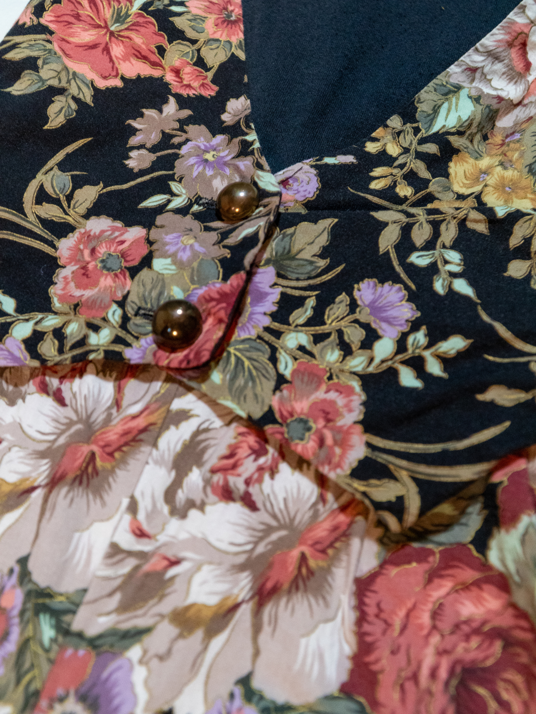 Florals with gold gilded accents bloom from the waist down in rich, moody tones. Finished with decorative front buttons and an adjustable tie-back waist. it's giving Eliane Benes (Seinfeld) or Aunt Franny (Practical Magic).