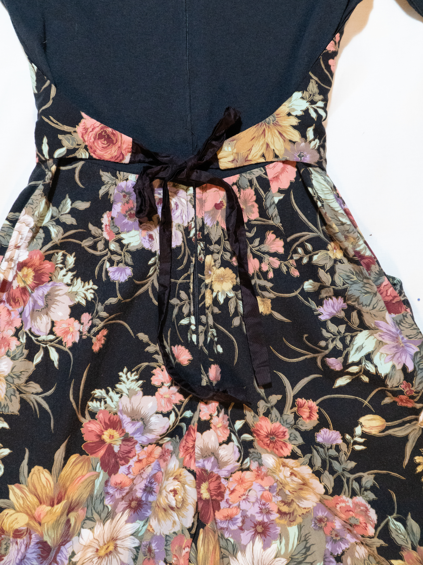• Mixed-fabric construction (knit bodice with woven floral panels)
