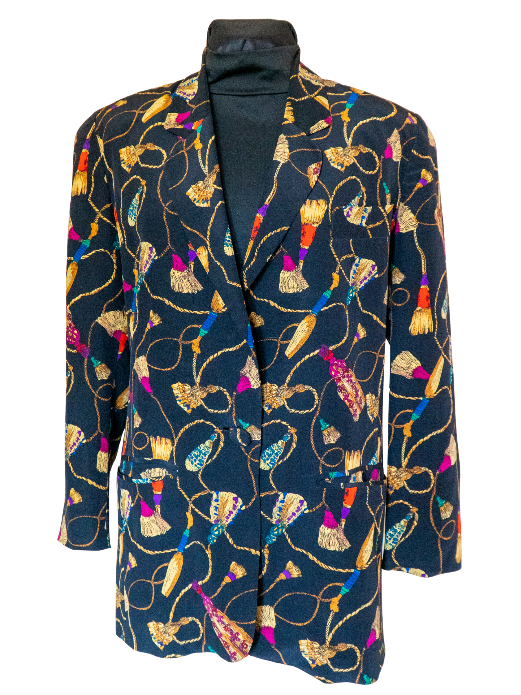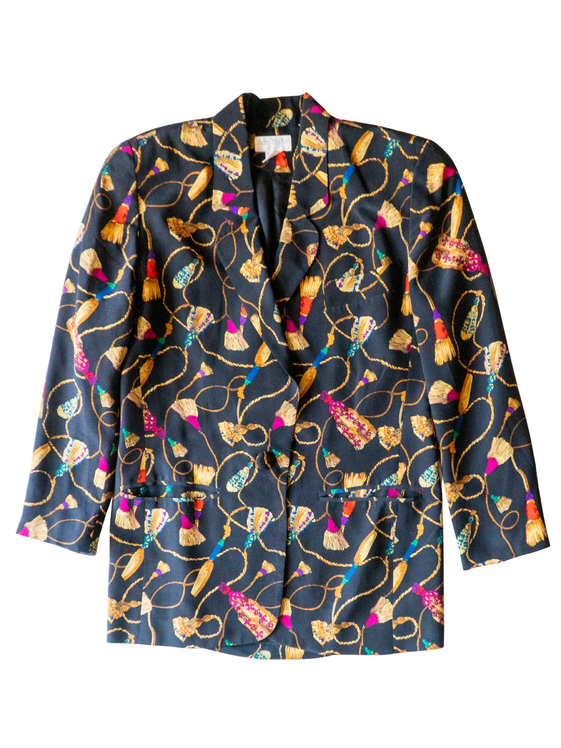 1980s Ann Taylor Studio blazer in 100% silk is a maximalist dream — woven through with ornate golden ropes and jewel-toned tassels that shimmer against a black backdrop. It’s the kind of jacket that could talk its way past the velvet rope and then hold court once inside.
