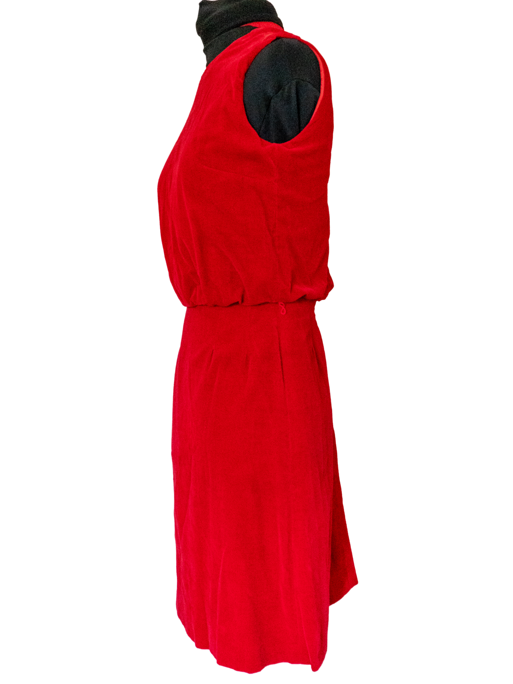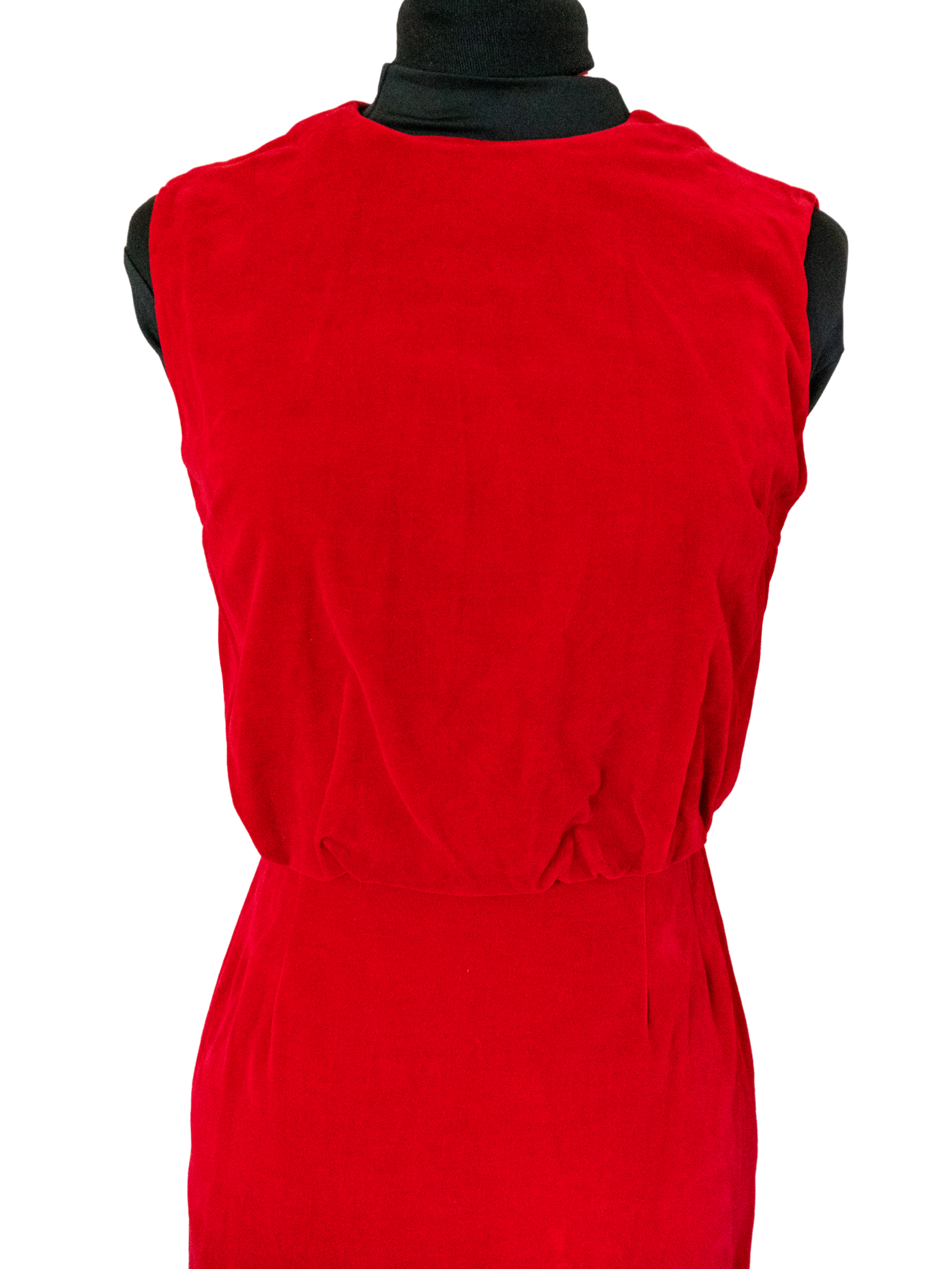 The fabric is a soft red velvet in a vibrant red. Covered buttons fasten up the back.