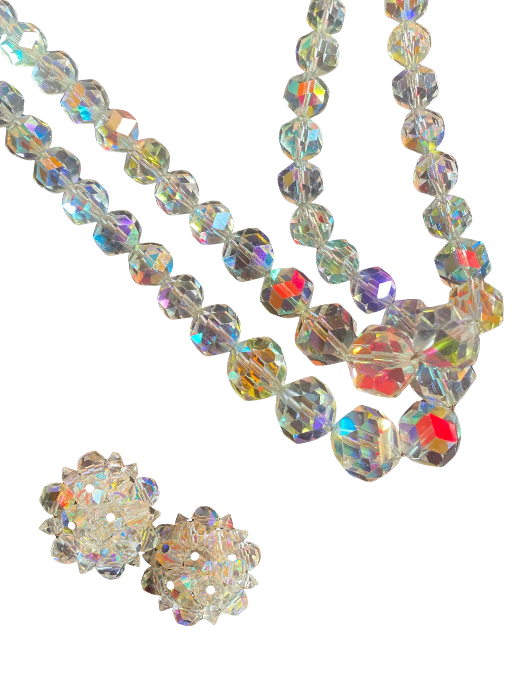 This vintage Aurora Borealis crystal necklace and earring set captures the ethereal light play that defined midcentury glamour. Introduced by (the ultimate drama queens) Swarovski in the 1950s, the “Aurora Borealis” coating gave glass beads an iridescent, prismatic finish — designed to mimic the Northern Lights and adored by designers like Dior and Miriam Haskell.