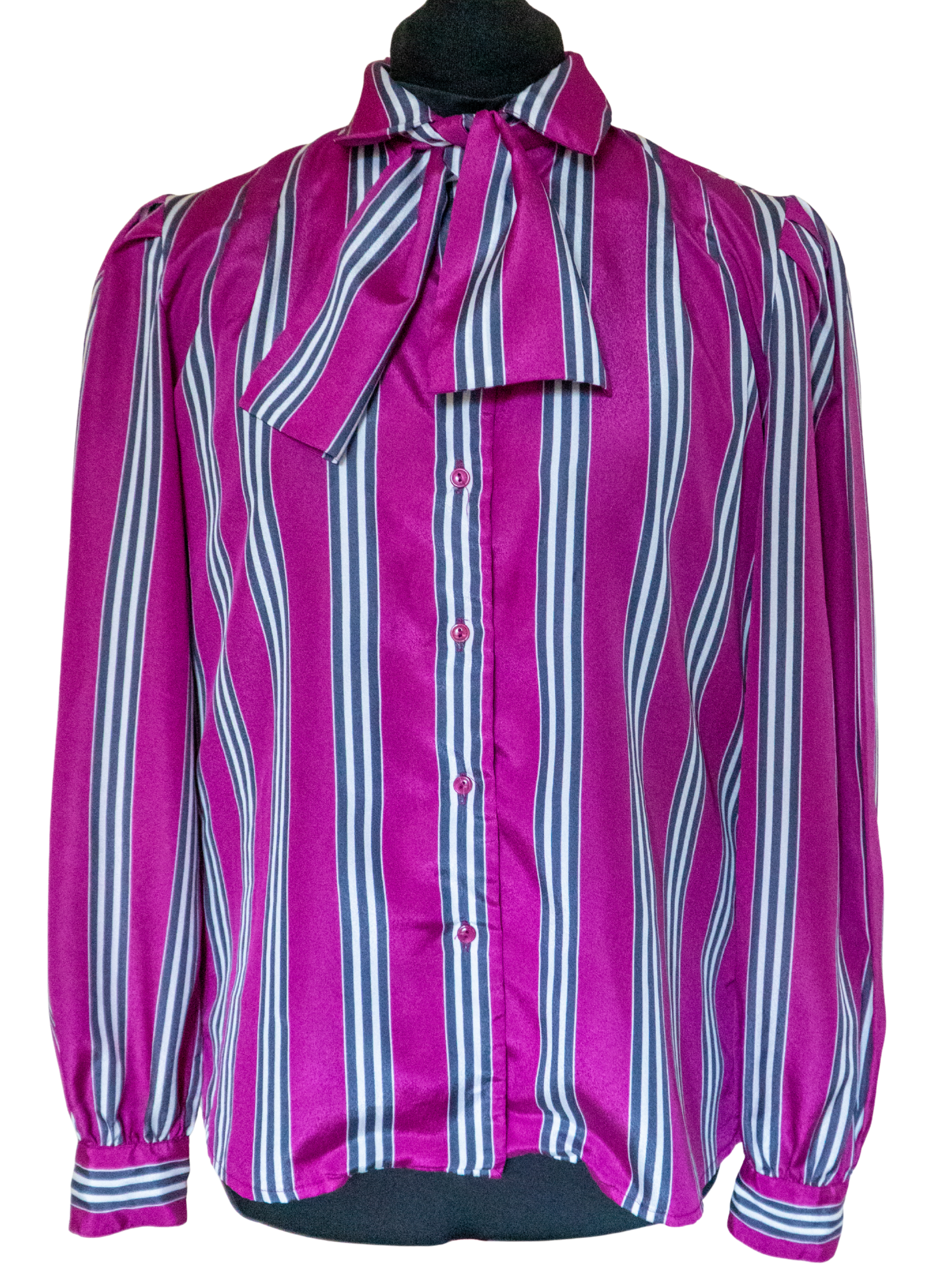 Midnight Stripes: 1980s Magenta & Black Pussybow Blouse