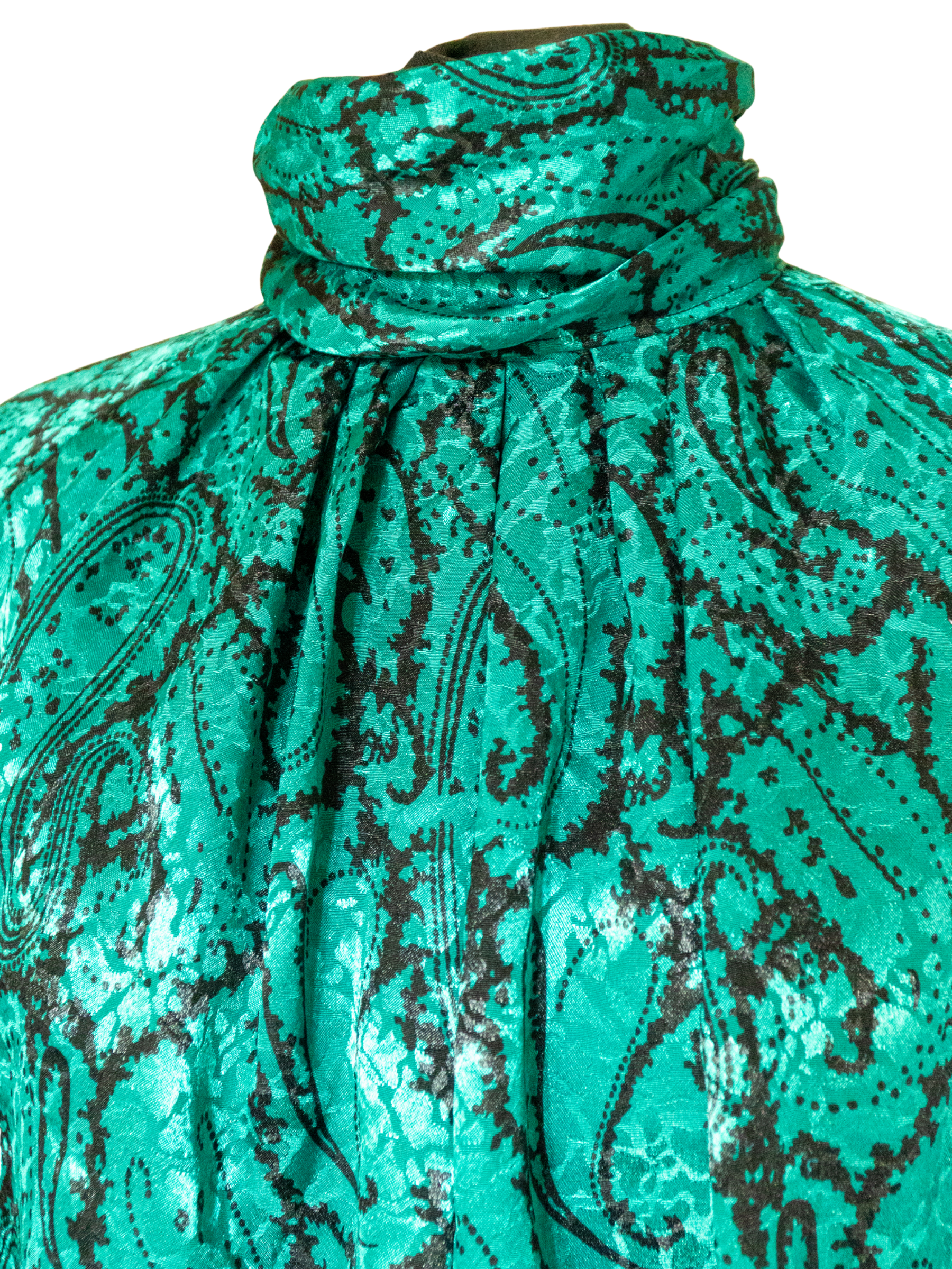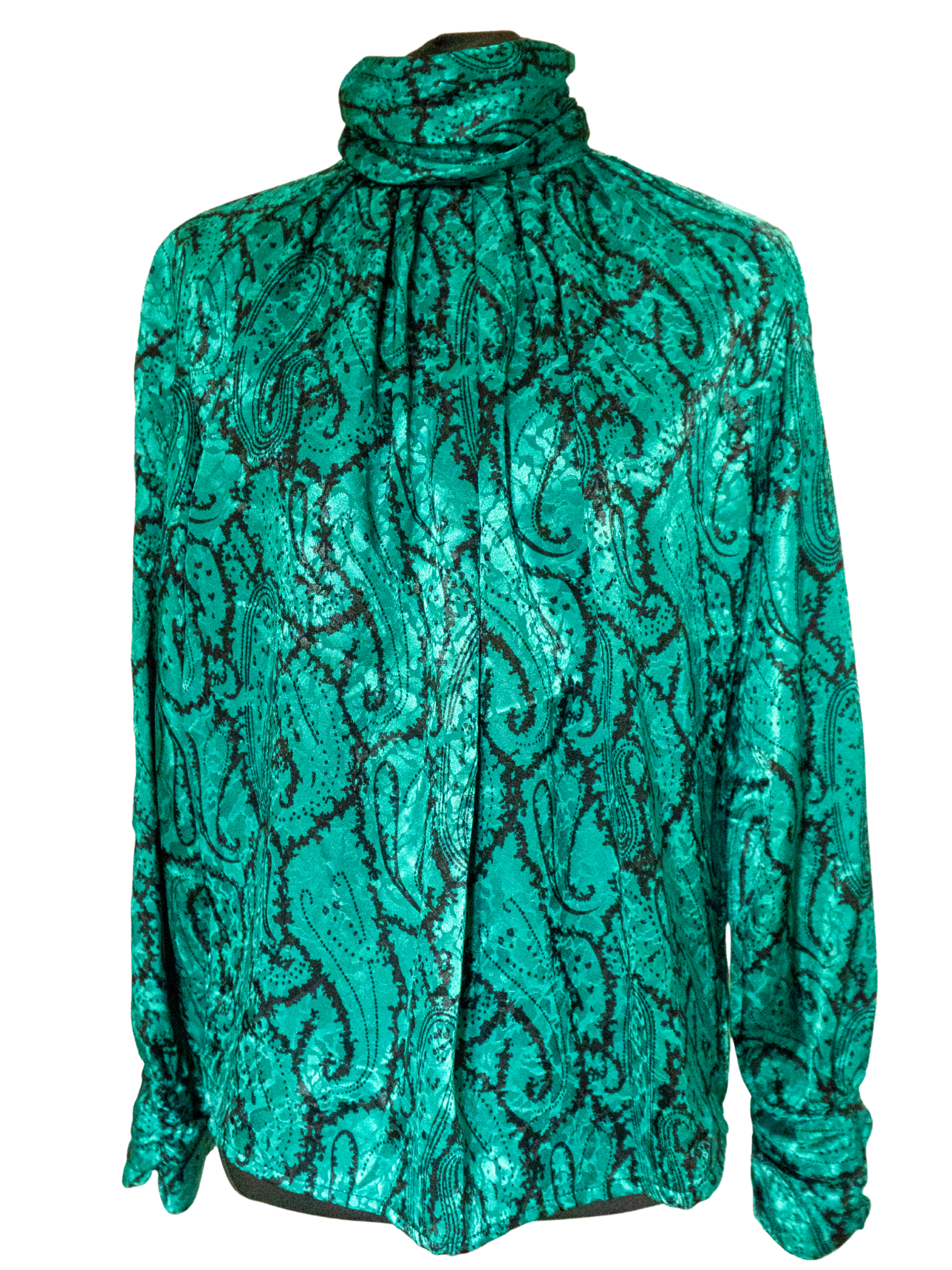 Slip into this silky green paisley STUNNER. She’s got drama in all the right places: a ruched mock turtleneck and cuffs, delicate covered buttons, billowing raglan sleeves, and fabric that could hypnotize from across the room.