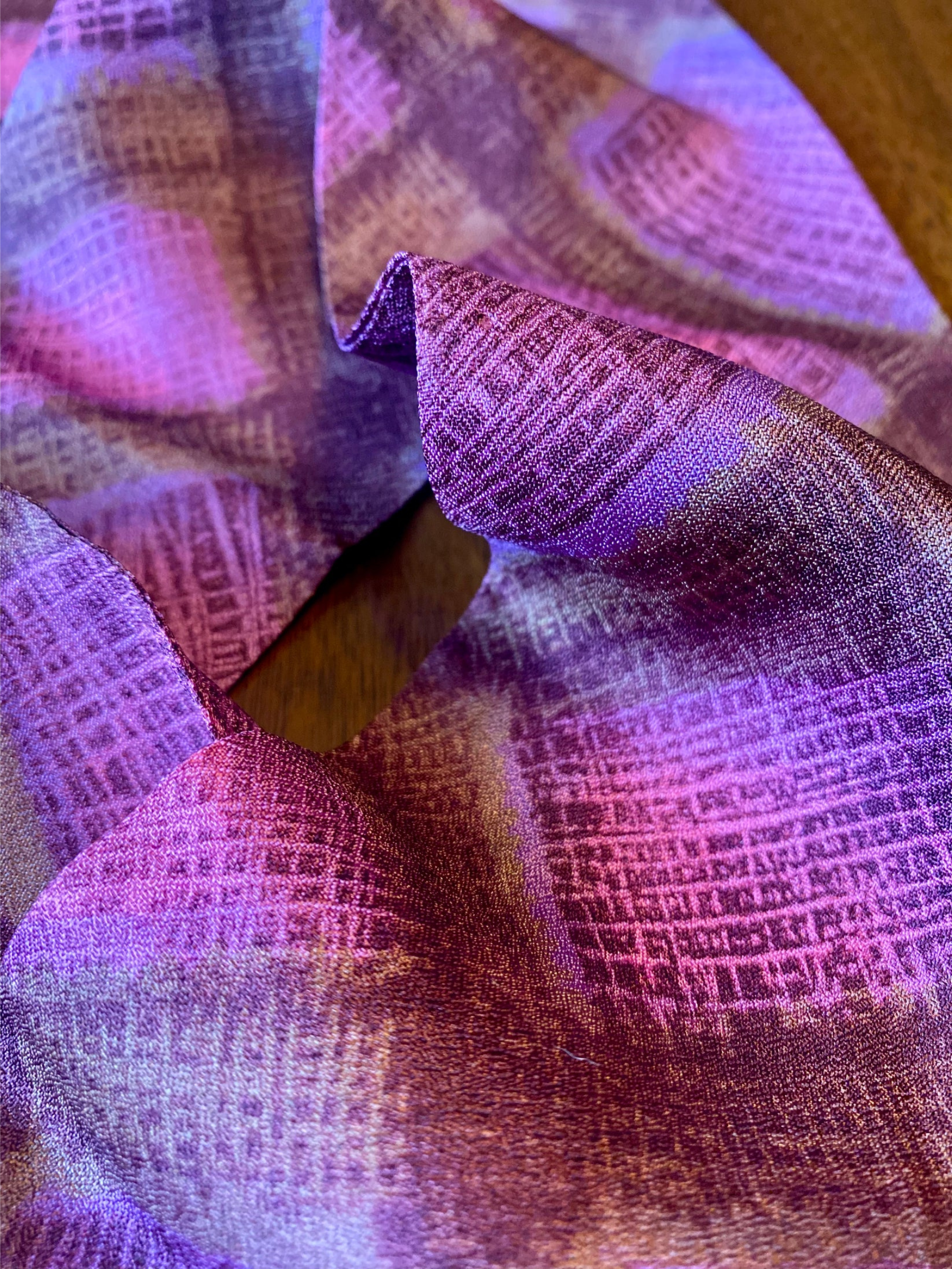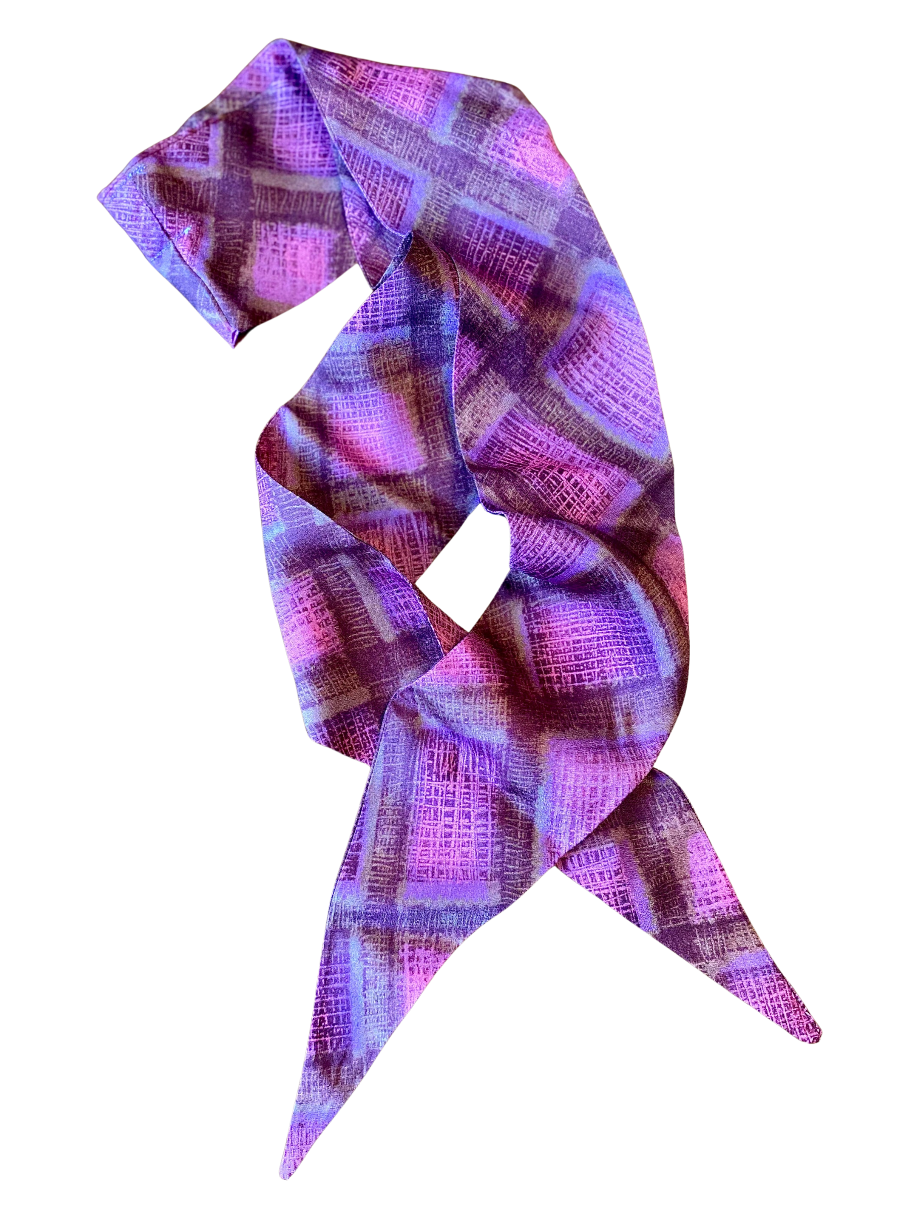 This deadstock silk scarf is the perfect pop of print. The silky abstract tartan scarf is equal parts bold and playful in shades of Brown, Gold, Pink, and Purple.